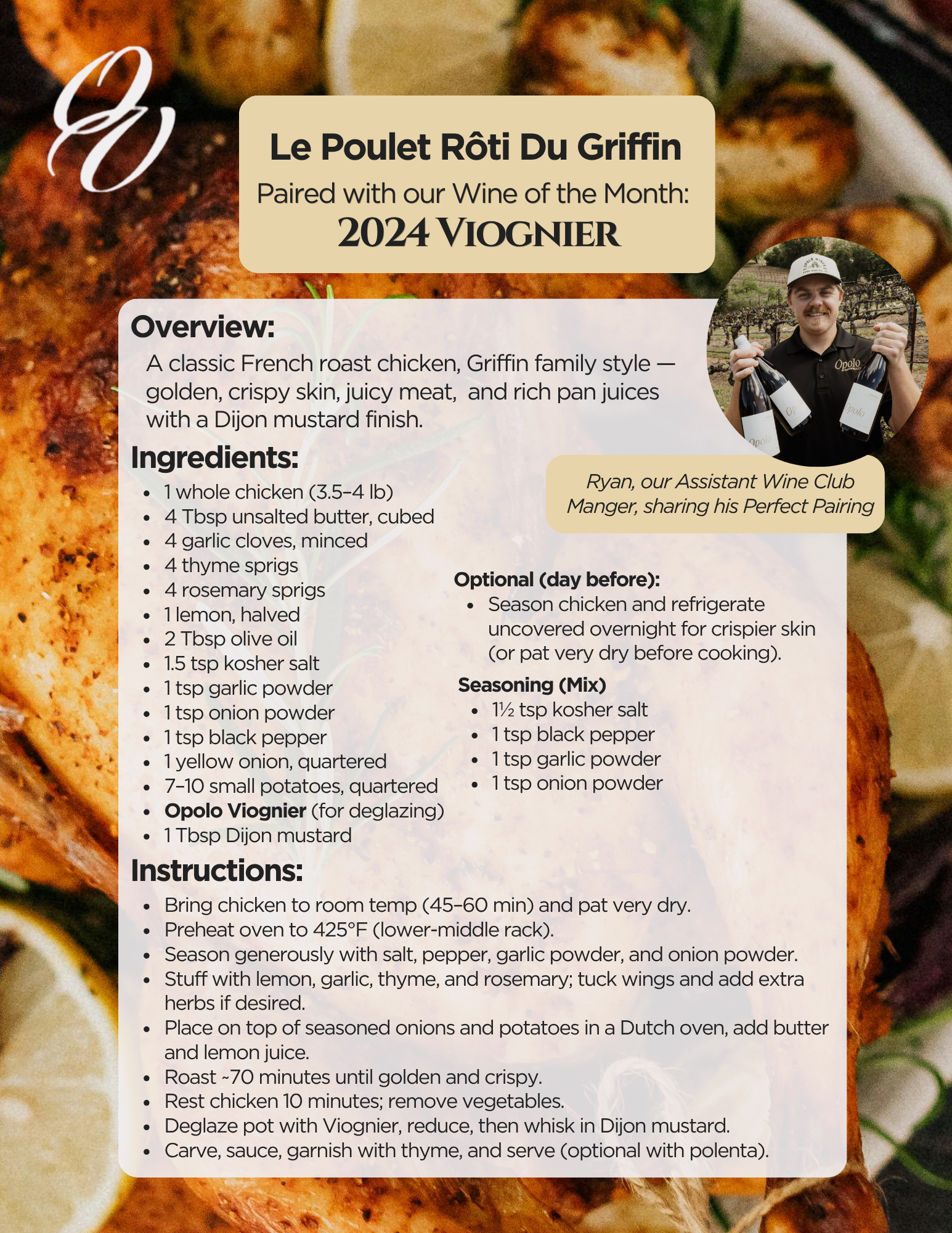 From Ryan: “This French Roast Chicken is simple yet elegant, perfect for that midweek after work dinner, pairing beautifully with Opolo’s Viognier. All together blending elements of savory umami, summer fruit, and bright acidity makes this pairing not one to miss!”
